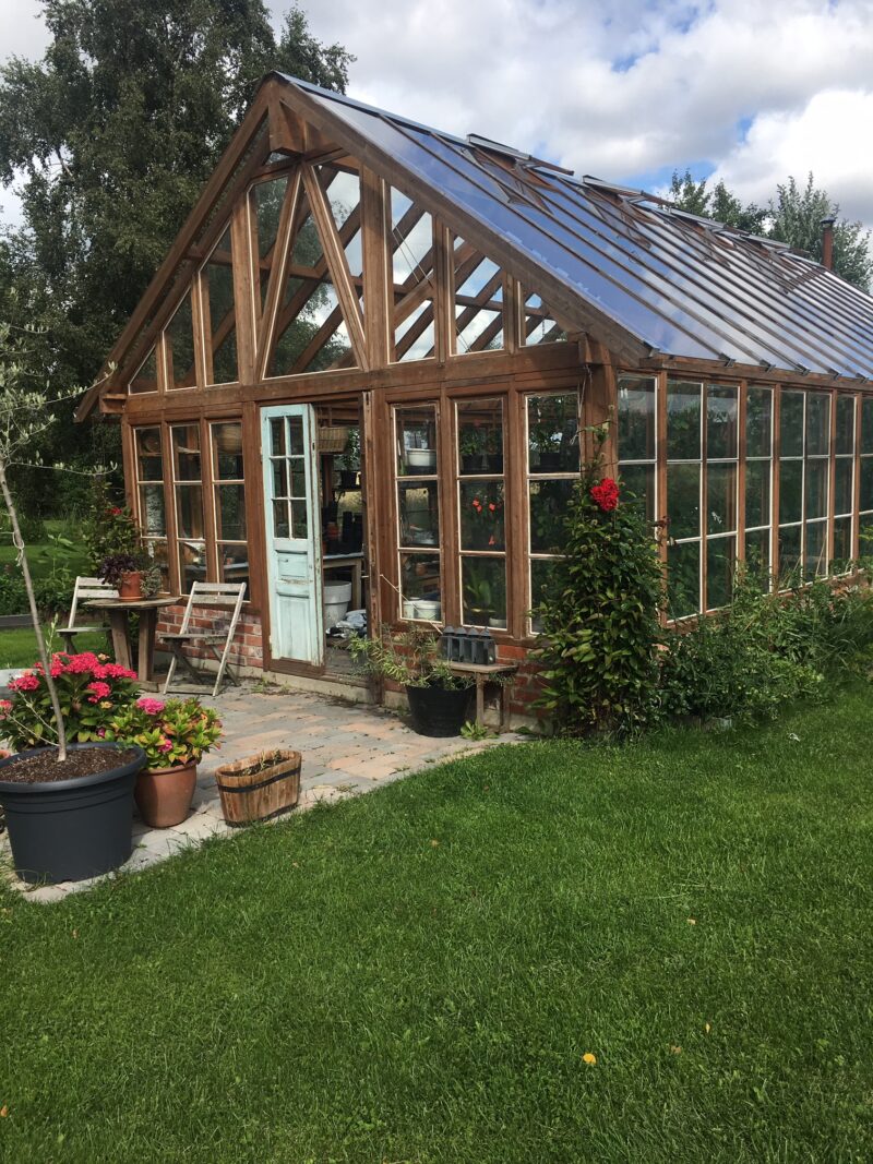 Efter sådär 24 års drömmande om vad jag skulle göra med de gamla fönstren som plockades ur vårt hus 1947 blev projektet äntligen verklighet. Det blev ett växthus. Återanvänt material för det mesta, speciallösningar och duktiga människor hjälpte till att göra det till en härlig plats att vara på.